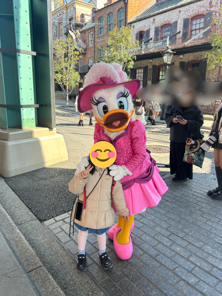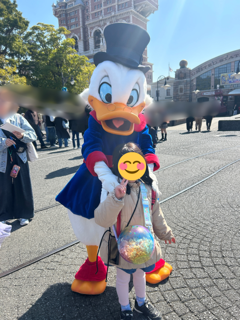 • キャラとの遭遇: デイジーや、ドナルドの叔父さん「スクルージ・マクダック」と写真撮影。名前を呼んで挨拶するのは人間関係の基本ですね。
